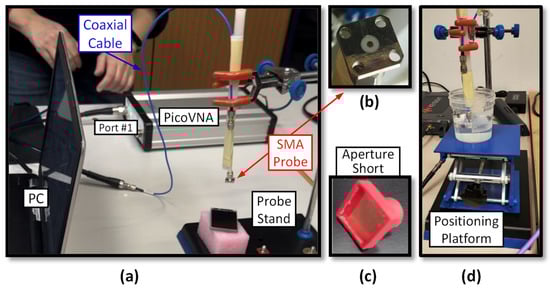 The low-cost system employs an SMA coaxial probe connected to a VNA. We use either a PicoVNA 106 (300 kHz–6 GHz; Pico Technology Ltd., St Neots, Cambridgeshire, UK) (in the photo in Figure 3a) or a Keysight Streamline P9374B (9 kHz–20 GHz; Keysight Technologies, Santa Rosa, CA, USA). All the measurements were taken with an intermediate-frequency bandwidth of 3 kHz, a source power of −10 dBm, and 16 trace averages. The SMA probe was built from a panel-mount connector (model R124510000; Radiall SA, Aubervilliers, France), whose center pin was cut and filed flush with its square mounting plane (Figure 3b). The center conductor is ∅i = 1.28 mm in diameter, and the outer conductor’s inner diameter is ∅d = 4.1 mm.