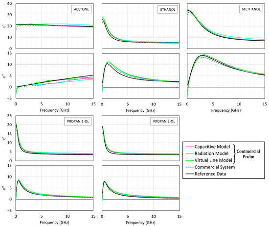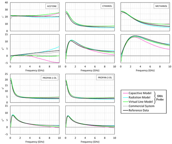 The real part (top panel) and the imaginary part (bottom panel) of the measured permittivity of acetone, ethanol, methanol, propan-1-ol, and propan-2-ol. The measurement results with the SMA probe are shown in continuous pink, blue, and green lines corresponding to the capacitive, radiation, and virtual line models, respectively. The reference data according to [52] is shown in a continuous black line. The results obtained with the commercial probe and its measurement suite are shown in dashed lines.
