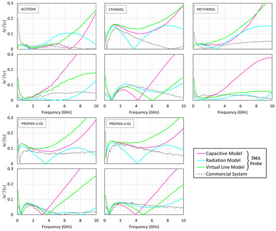 The errors in the real part (top panel) and the imaginary part (bottom panel) of the measured permittivity of acetone, ethanol, methanol, propan-1-ol, and propan-2-ol. The measurement results with the SMA probe are shown in continuous pink, blue, and green lines corresponding to the capacitive, radiation, and virtual line models, respectively. The results obtained with the Keysight probe and its measurement suite are shown in dashed lines.