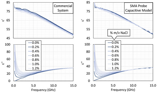 A clear distinction was observed in the performance of the electromagnetic models depending on probe geometry. For the commercial probe, which features a narrower aperture and reduced fringing fields, the capacitive model proved sufficiently accurate across a test range of 0.01–15 GHz. Its analytical simplicity, invertibility, and stability make it robust and efficient, particularly for clinical or industrial settings requiring quick and consistent measurements. In contrast, for the custom SMA-based probe—characterized by a wider geometry and greater radiation losses—the capacitive model showed increasing discrepancies above ~3–4 GHz, especially with lossy or conductive materials. In this case, the radiation model offered superior accuracy, particularly in reproducing the imaginary part of the permittivity (ε″) in conductive samples. The virtual line model provided a stable, but generally intermediate, performance.