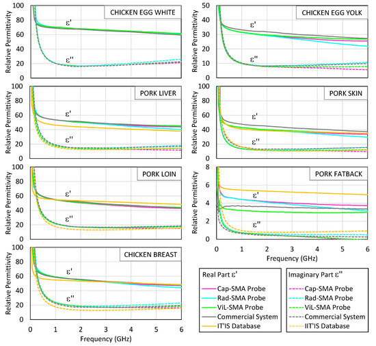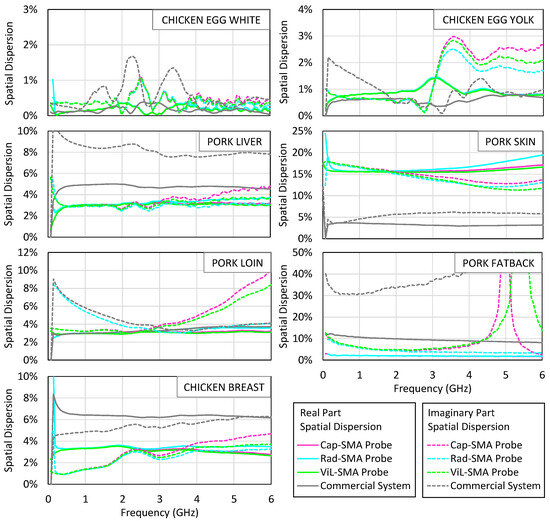 The spatial dispersion of the real part (solid line) and the imaginary part (dashed line) of the measured permittivity of egg white, egg yolk, pork liver, pork skin, pork loin, pork fat, and chicken breast. The measurement results with the SMA probe are shown in pink, blue, and green lines corresponding to the capacitive, radiation, and virtual line models, respectively. The results obtained with the commercial system are shown in grey lines. The dispersion was computed as the maximum deviation from the mean across three measurements, normalized by the mean.