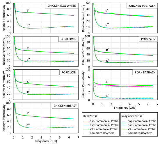 The results obtained with the commercial probe. The real part (solid line) and the imaginary part (dashed line) of the measured permittivity of egg white, egg yolk, pork liver, pork skin, pork loin, pork fat, and chicken breast. The results processed with the capacitive, radiation, and virtual line models are shown in pink, blue, and green lines, respectively. The results obtained with the Keysight probe and its measurement suite are shown in grey.