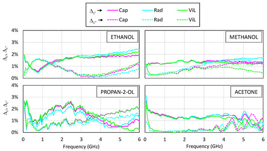 The reproducibility of the complex permittivity measurements for different reference liquids (ethanol, methanol, propan-2-ol, and acetone) obtained with three low-cost SMA probes. The graph shows the maximum normalized deviation from the average value, represented as a function of frequency for the three models used: capacitive (Cap), radiation (Rad), and virtual line (ViL). The continuous lines correspond to the real part, , and the dashed lines correspond to the imaginary part, .