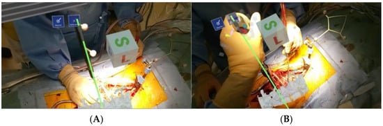 (A) Surgeon’s gaze. Navigation guides are matched with virtual lines supported by augmented reality technology. (B) A pedicle screw is inserted into the virtual line with 3D augmented reality technical support.