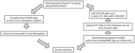 HoloLens 2 (Microsoft Corporation, Redmond, WA, USA) was used as the optical see-through type HMD, and Holoeyes MD (Holoeyes Co., Ltd., Tokyo, Japan) [5], a managed medical device, was used as an application (Figure 1). Holoeyes MD integrates image data obtained from multiple modalities and displays 3D organ models like holograms, which are widely used for preoperative planning and surgical support [6,7,8,9,10,11]. Holoeyes MD is an application that uploads 3D polygon models (STL files) created with DICOM data editing programs such as VINCENT (FUJIFILM Co., Ltd., Tokyo, Japan) from CT data to the Holoeyes server and then downloads them to the terminal at hand, enabling the polygon models to be freely displayed in three dimensions. The application allows the polygon model to be freely moved, zoomed in and out, and displayed in cross-section. The application is included within the Holoeyes MD application. The Virtual Line function allows a line with three-dimensional information to be placed in space, so that the two-dimensional information on the direction of the vertebral root screw insertion confirmed by navigation can be manually aligned by the surgeon and placed as three-dimensional information on the operating field through the Hololens screen.