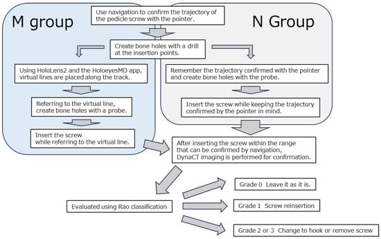 First, a reference frame was placed on the spinous process under general anesthesia, and DynaCT was performed using ARTIS Pheno (Siemens Healthcare, Forchheim, Germany). The DICOM data were then sent to the navigation system (Brainlab Curve, Brainlab, Westchester, IL, USA) to confirm the accuracy of the navigation. Concurrently, the DICOM data were edited using VINCENT to create an STL file of the spine, which was then uploaded to the Holoeyes server. The file was converted into a polygon model usable in the app and confirmed that the polygon data could be downloaded and used on the HoloeyesMD app on the HoloLens2 (Figure 4). In the M group, the spinal polygon model was displayed to visually assess the rotation of the vertebral bodies, and a virtual line was set on the PS trajectory confirmed by navigation using MR. Pedicle screws were then inserted while confirming the surgical field. In the N group, the surgeon memorized the PS trajectory confirmed by the navigation system and inserted the pedicle screw (Figure 5). In cases where rotation was severe, and it was difficult to visualize the overall picture, a 3D model of the spine was created from CT images taken during surgery, which was then superimposed on the actual surgical field to visualize the rotation of the vertebral body before inserting the screw.