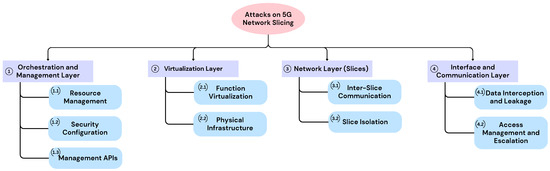 Table 6 complements the proposed classification by detailing specific attack vectors associated with each architectural layer and subcategory. Each entry in the table reflects the numbering system of the classification, ensuring consistency between the hierarchical classification and the identified threat vectors. This structured overview facilitates a clearer understanding of how different attack surfaces relate to the respective network slicing components and highlights critical areas requiring targeted security measures.