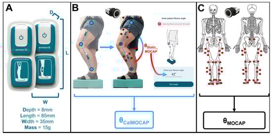Eligible participants consented at the biomechanics laboratory ~1-week pre-TKA. Participants then completed a sensor-use instruction session (Figure 1A; MotionSense, Stryker, Mahwah, NJ, USA) to ensure proper wearable motion sensor system use. Subsequently, sensors were applied to the impacted lower extremity per manufacturer instructions via supplied adhesive patches. IMU sensor calibration was then completed according to manufacturer recommendations (standing with the impacted leg elevated on a 10 cm block and inputting that pose’s sagittal knee angle [24,25]). In our previously published study [25], goniometric calibration angles were significantly different than MOCAP-measured calibration angles. Accordingly, herein we used MOCAP-measured sagittal knee angles during the calibration pose for calibrating the wearable sensor system (Figure 1B).