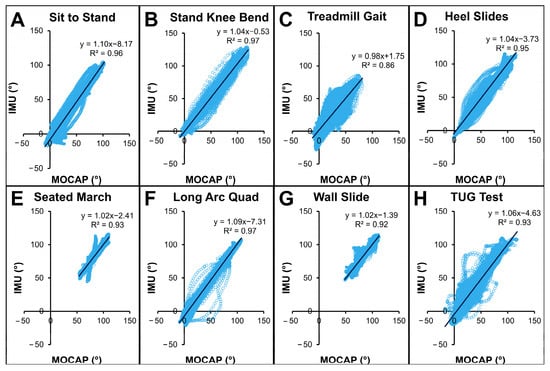 Cross plots for all activities ((A) sit to stand, (B) standing knee bends, (C) treadmill gait, (D) heel slides, (E) seated march, (F) long arc quadriceps exercise, (G) wall slides, and (H) timed up and go test) showed good correspondence between MOCAP-computed and IMU-computed sagittal knee angles.