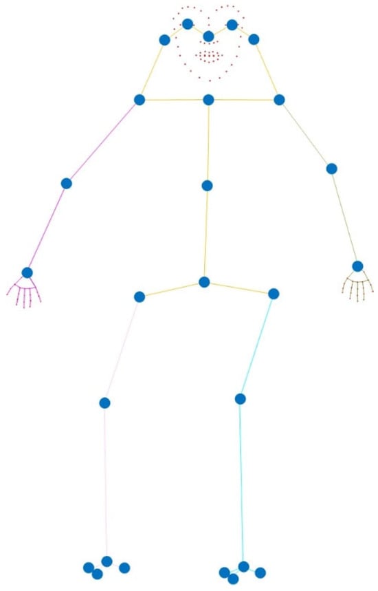 According to the structural characteristics of human anatomy, the human body is divided into multiple main segments, such as the head, trunk, upper limbs, and lower limbs. According to the “Inertial Parameters of Adult Human Body []”, we establish the connection between the keypoint position and the mass of the body segment and assign relative mass coefficients to each body segment to regard the human body model as a real physical model. The relative mass distribution of the “Inertial Parameters of the Adult Human Body” is shown in Table 1.