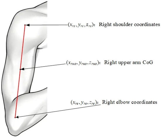 Multiply the right shoulder joint coordinates by the corresponding proximal coefficient and the right elbow joint coordinates by the corresponding distal coefficient to obtain the three-dimensional center of gravity coordinates of the right upper arm as expressed in Equation (8):