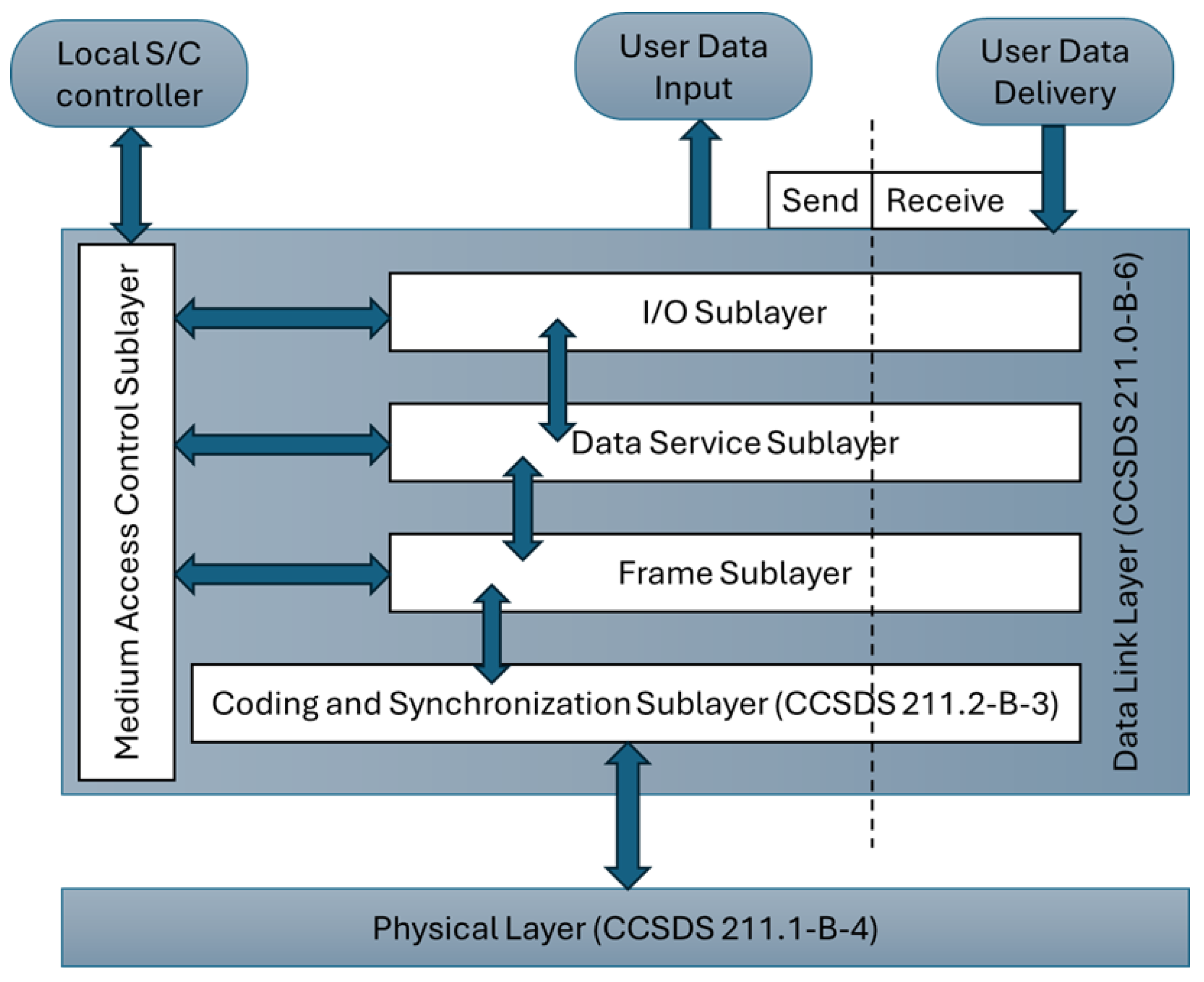 - Data Link Layer (DLL): it provides mechanisms for framing, error control, and flow control to ensure the integrity and efficiency of data transmission. It ensures reliable delivery of data using Automatic Repeat reQuest (ARQ) and provides services for both acknowledged and unacknowledged data transfers. It includes protocols for packetization, error detection and correction, and management of data link connections. This layer furthermore consists of a Medium Access Control (MAC) and Coding and Synchronization sublayers.