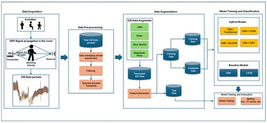 A four-stage approach for HAR using CSI is proposed. The schematic diagram of the proposed framework is illustrated in Figure 1, designed to enhance recognition performance, particularly in complex multi-user home environments. The pipeline of the proposed approach comprises data acquisition, preprocessing, augmentation, and model training/classification. The data acquisition involves transmitting Wi-Fi signals through an indoor space where human activities occur. Motion-induced perturbations of these signals are captured as CSI measurements at the receiver, inherently encoding characteristics of static postures and dynamic movements, forming the raw dataset.