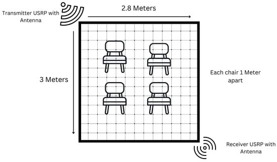 As illustrated in Figure 2, the experimental setup involved two Universal Software Radio Peripheral (USRP) devices: a USRP X300 as the transmitter and a USRP X310 as the receiver. Both were equipped with VERT2450 omnidirectional antennas and operated at a frequency of 3.75 GHz within the 5G sub-6 GHz band, chosen for its ability to capture subtle human motion with low interference and high signal resolution. The transmitter and receiver were positioned diagonally opposite each other in the room to establish a reliable communication link and maximise spatial signal coverage. Within the defined activity zone, consisting of four chairs arranged in a 1 m grid, participants performed various daily activities. During these activities, the USRP devices continuously collected CSI data using the GNU Radio software environment. The communication protocol used Orthogonal Frequency-Division Multiplexing (OFDM), providing robust frequency-domain information. The raw CSI data was initially logged in plain text format and subsequently converted to CSV files for preprocessing and machine learning analysis [36].
