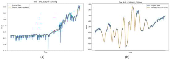 Comparison of original and Butterworth-filtered CSI signals for single-user and multi-user activity sessions. (a) One subject standing, (b) three subjects sitting.