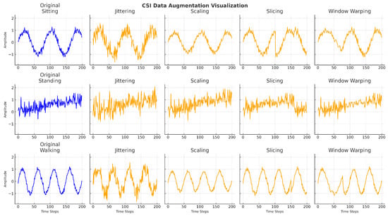 Another inherent challenge associated with CSI-based HAR is data scarcity, which significantly limits the training of deep learning models, especially in complex multi-user and real-world scenarios where manual annotation is inefficient. Data augmentation provides a viable strategy to address this and improve model robustness [12,13]. Unlike image augmentation, time-series augmentation for CSI data must preserve signal continuity, statistical integrity, and temporal dynamics. Techniques like jittering (Gaussian noise), scaling (amplitude modulation), magnitude warping (non-linear time scaling), and slice shuffling (temporal segment permutation) generate realistic signal variations mimicking unseen behaviours or environments [14]. The application of these augmentations increases data diversity and enhances the generalisation of models trained with limited data.