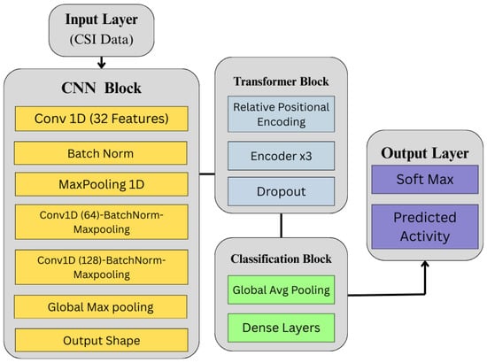 Our model architecture, depicted in Figure 5, uses a hybrid deep learning framework combining CNN and Transformer encoders for effective local and global feature extraction from time-series CSI data. This design captures the complex temporal features of HAR tasks by taking advantage of the CNN layers to learn local dependencies and the Transformer block for long-range contextual relationships [44,45]. See also Table 3 for the hyperparameter settings of the proposed CNN + Transformer model. The model consists of three components: a CNN layer for feature extraction, a Transformer block for relative positional encoding, and a classification head. This is denoted as