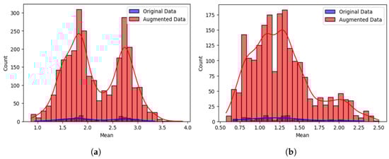 Sensitivity analysis comparing the distribution of mean values between original and augmented CSI data for two multi-user activity scenarios: (a) two subjects performing, one sitting and one standing, and (b) three subjects performing, two sitting and one standing. Augmented data (red) show broader tails but remain centred similarly to original data (blue): (a) two subjects, one sitting and one standing (b) three subjects, two sitting and one standing.