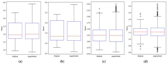 In Figure 7, the boxplots for four activity configurations are presented, comparing spread, median, and outliers. The plots confirm that augmentation maintains the original data’s distributional characteristics, with only minor variability introduced in higher-subject configurations.