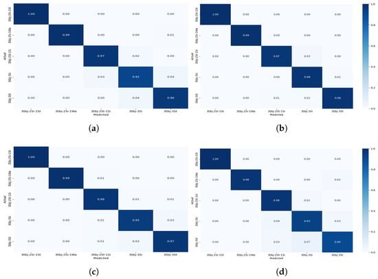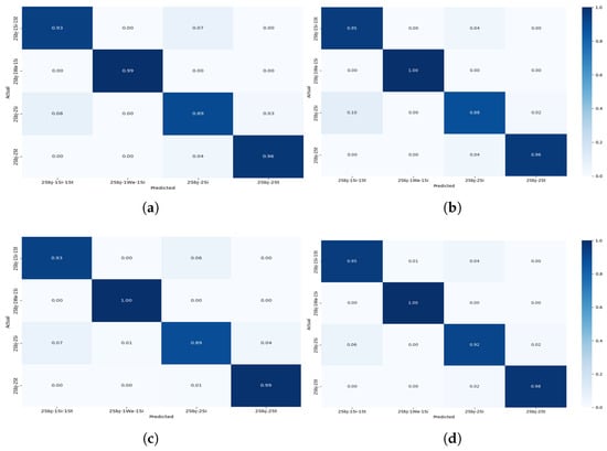 Confusionmatrix for Experiment II showing the performance of the models for multi-users—4 subjects for different activities: (a) CNN + Transformer (b) CNN + GRU (c) CNN + BiLSTM (d) CNN + LSTM.
