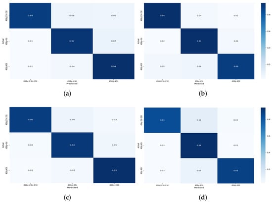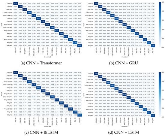Confusion matrix for Experiment II showing the performance of the models for multi-users—3 subjects for different activities: (a) CNN + Transformer (b) CNN + GRU (c) CNN + BiLSTM (d) CNN + LSTM.
