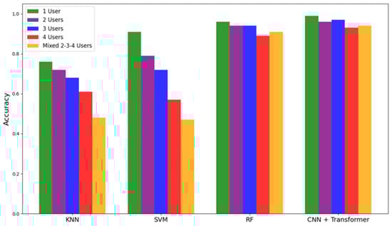 To further assess model efficacy, an additional comparative experiment was conducted using classical machine learning classifiers KNN, SVM, and RF across the same multi-user configurations. The accuracy scores are visualised in Figure 12, with individual bars representing performance across 1-user, 2-user, 3-user, 4-user, and mixed 2-3-4 user setups. It is observed that, in contrast to classical models, CNN + Transformer performed best across all configurations, with performance only marginally affected as user concurrency increased. KNN and SVM, in particular, showed notable declines in accuracy as the number of users increased. This is primarily due to their limited ability to disambiguate overlapping signal sequences in the temporal domain. These results further demonstrate the proposed model’s effectiveness and its suitability for multi-occupant applications where distinguishing between concurrent activity streams is critical.