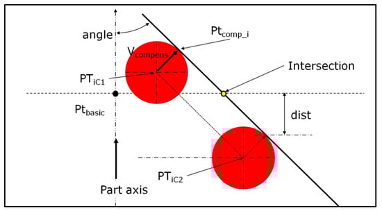 Vcompens is a unit vector by definition of the cross product between two unit perpendicular vectors. The dot product between the compensation vector and the approach vector must be positive. This allows for the compensation of the ball radius on the right side.