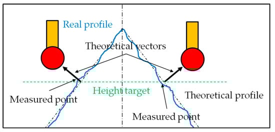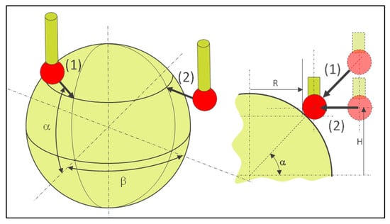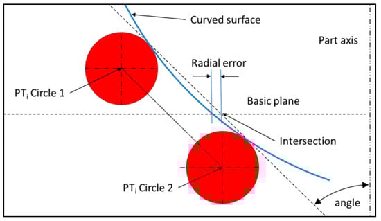 Figure 6) at different angles with a gap between circles to minimize the defects. The measured circle is constructed from vector points with a direction perpendicular to the tangent at the target coordinates. In the case of the sphere, the vector is radial.