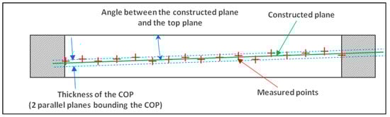 In this instance, the line constructed from the contact points must be intersected with a plane containing the theoretical coordinates of a point and the vector normal to the surface at that point. There are as many planes as constructed lines. The direction of the measured deviation must follow the theoretical normal vector [