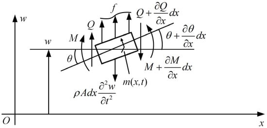 The dynamic deformation during the vibration without external force conditions will be analyzed below. The previously established model can be regarded as an Euler–Bernoulli beam, with wf (x,t) representing the deflection of the neutral axis of the cross-section at position x and time t. A force analysis is conducted on a differential segment of the length dx of the beam, as shown in Figure 3. Q and M represent the shear force and bending moment on the left section, while f, m, and represent the external force, external moment, and inertial force acting on the differential segment of the beam, respectively.