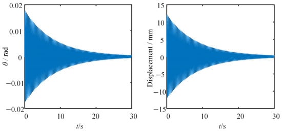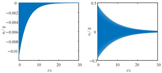 Figure 5 shows the time domain curve of the x-axis acceleration ax and y-axis acceleration ay, respectively. Figure 6 shows the time domain variations in the tilt angle and the displacement at the free end of the beam.