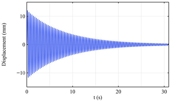 In the transient analysis, a 0.1 s pulse load was first applied at the free end. The time-dependent displacement curve of the cantilever beam’s free end under the free vibration decay is shown in Figure 7. It can be observed that the structural vibration almost completely decays to zero within 30 s. The dynamic characteristics are consistent with both the MATLAB numerical simulation and experimental results. Further, a sinusoidal excitation load with a frequency of 3.11 Hz is applied at the free end of the beam, and the steady-state vibration response of the structure is obtained through the simulation. Figure 8 shows the time variation in the displacement at the free end after the vibration stabilizes, which is consistent with the experimental results.