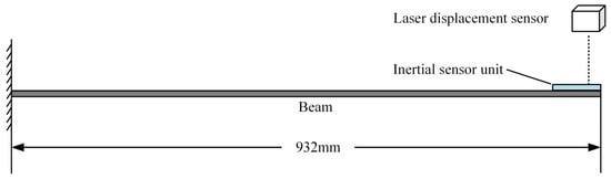 To validate the performance of the developed inertial sensor, an experimental platform based on a cantilever beam structure was built, as shown in Figure 9. The cantilever beam was made of 45 steel, with a length of 932 mm, a width of 40 mm, and a thickness of 4 mm. The inertial sensor was mounted at the free end of the cantilever beam. At the same time, the high-performance laser Doppler vibrometer OFV-505/5000 (Polytec GmbH, Waldbronn, Germany) is used for high-precision reference displacement measurements for the comparative analysis. Its displacement resolution is better than 0.05 pm, and the frequency range is from 0 to 2.5 MHz. The IMU’s cut-off frequency was set to 80 Hz, with a data output frequency of 800 Hz. This configuration effectively filters out high-frequency noise while preserving valid data, thereby enhancing the measurement accuracy and reducing interference. Before the experiment began, we also performed zero-bias calibration on the IMU based on the horizontal reference plane.