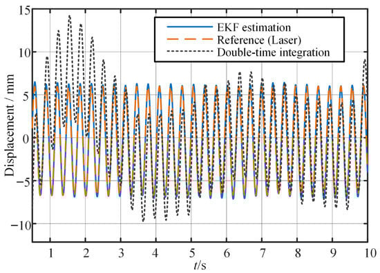 First, a modal analysis is performed to determine the system’s first-order natural frequency, which is 3.08 Hz. Subsequently, a synchronous sinusoidal excitation load is applied to obtain the steady-state vibration response of the structure. As shown in Figure 10, the blue solid line and the orange dashed line represent the displacement variation curves at the free end of the beam measured by the inertial sensor and the laser displacement sensor, respectively. It can be seen that the trends of the two curves match closely, with the maximum amplitude deviation within 4%. We also calculated the displacement from the measured acceleration signal using dual time integration and subsequent high-pass filtering with a cut-off frequency of 0.2 Hz and added the displacement to the graph as shown by the black dotted line. The results indicate that the displacement prediction using the enhanced EKF yields better results.