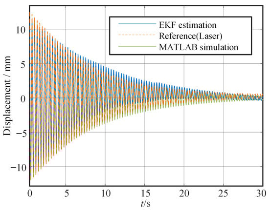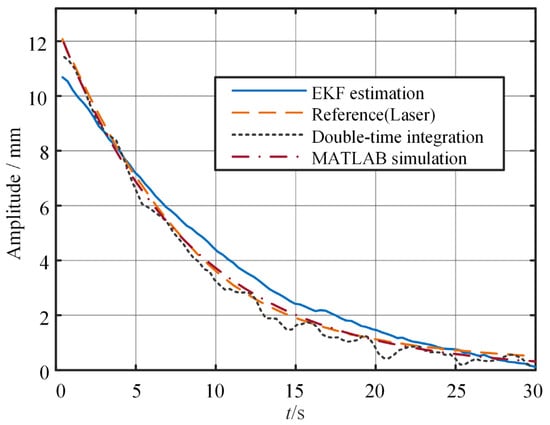 In the free vibration test, the cantilever beam, pre-lifted and then released, is used to assess the sensor performance throughout the entire attenuation process. Figure 11 and Figure 12 show the time domain curves of the amplitude and displacement at the end of the beam under the free vibration, respectively. Figure 11 shows that under free vibration conditions, the amplitude deviation is large initially (approximately 11%), but it decreases to a lower level over time. Notably, the vibration attenuation trend and phase characteristics output by both sensors are identical, confirming the inertial sensor’s effective capture of the structural bending vibration and demonstrating its reliability in providing critical dynamic information for vibration control. Compared with the results of the double-time integration, the results obtained by the EKF are also more stable. Furthermore, a comparison between experimental and simulation results also reveals small differences.