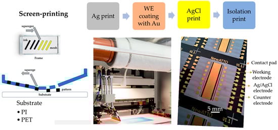 Step-by-step sensor fabrication: the process begins with the design of the electrodes; in this case, there are 16 working electrodes. Screen printing is employed to create a stencil for the electrode pattern. This is followed by preparing and precisely applying the electrode paste onto a polyimide (PI) or PET substrate, ensuring uniformity and adherence.