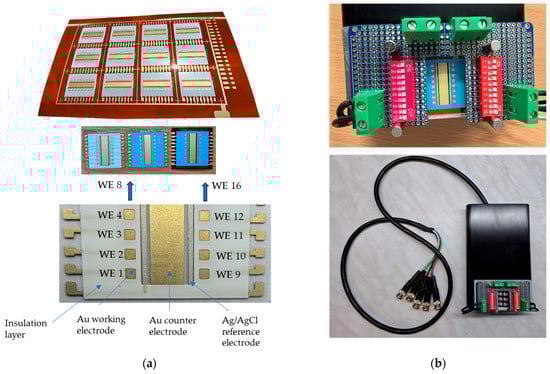 Sensors (12 sensors on a PI sheet) and integration: (a) Screen-printed sensors with a Au-sensor design, consisting of 16 working electrodes, a Au counter electrode, and a Ag/AgCl reference electrode, all printed on PI or PET substrates. Two insulation layers (white and blue) were tested. (b) The test setup in which the 16-electrode array was mounted for electrochemical measurements.