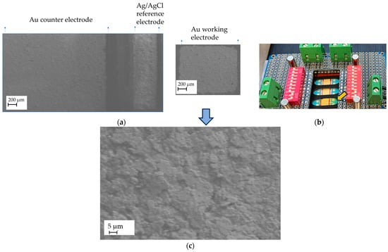 The potentiostat developed in collaboration with the University of Vienna (input amplifier OPA 128, input bias 700 fA, current/voltage amplifier OPA 111), equipped with ZEUS NT9software, was employed for electrochemical measurements using the screen-printed gold (Au) electrodes, fabricated as detailed in Section 2.3. A ZEISS FE-SEM “ΣIGMA HD VP” equipped with a TEAM Pegasus EDX system and a TEAM Octane Plus SSD detector was used for qualitative surface analysis.