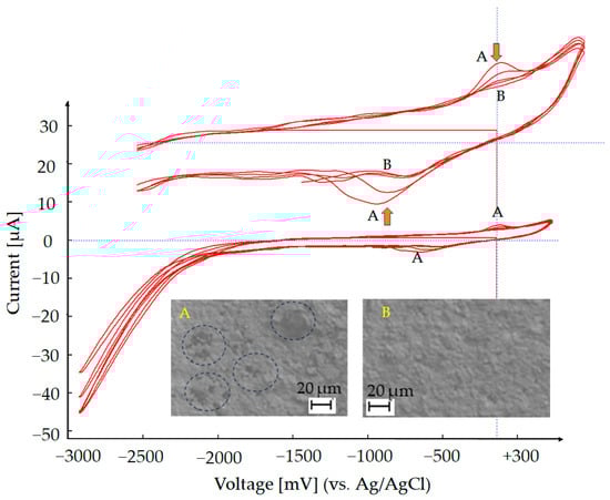 Au deposition via cyclic voltammetry (CV): Au was electrochemically deposited by cycling the potential between −3000 mV and +300 mV at a scan rate of 50 mV/s, using an 18-karat Au plating solution (TIFOO)—Region B. The A/B labels (yellow) are used to indicate specific regions in the SEM image and their corresponding positions in the CV. In this case, region A in the SEM figure highlights an area where the chemical gold coating is not uniform, while region B shows the same area after additional gold electrodeposition.