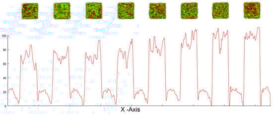 The area of the Au electrodes was analyzed using light reflection captured by a camera system in combination with 3D recognition software (ZEUS—developed by Attophotonics). The cut profile beneath the 3D scan shows a square working electrode with a side length of 1.3 mm. The analysis demonstrated a dimensional accuracy of 98.87% for the fabricated electrodes.