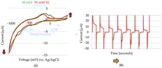 (a) Cyclic voltammetry performed at a scan rate of 50 mV/s in 0.1 M Na2SO3, with added Ni2+ from a 1 M NiSO4·6H2O stock solution: 10 µL (48 mM Ni2+) and 20 µL (91 mM Ni2+) added to 200 µL of electrolyte. (b) Chronoamperometric cycles applied at −1000 mV for 120 ms and 0 mV for 120 ms in 100 µL of 0.1 M Na2SO3, with increasing volumes of Ni2+ stock solution added: 0 µL, 10 µL, 20 µL, 30 µL, 40 µL, 50 µL, and 60 µL, corresponding to final Ni2+ concentrations of 0 mM, 91 mM, 167 mM, 231 mM, 286 mM, 333 mM, and 375 mM, respectively. The arrows indicate the direction of increasing nickel concentration. The reference electrode used was Ag/AgCl, and the counter electrode was Au.
