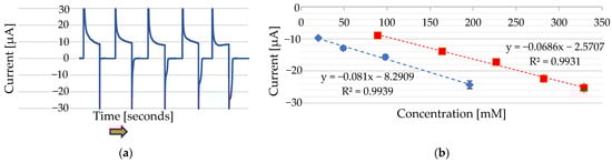 (a) Chronoamperometric cycles were applied at −1000 mV for 120 ms and 0 mV for 120 ms in 100 µL of 0.1 M Na2SO3, with incremental additions of Ni2+ from a 1 M NiCl2·6H2O stock solution. Added volumes of 0 µL, 2 µL, 5 µL, 10 µL, and 20 µL correspond to final concentrations of 0 mM, 20 mM, 48 mM, 91 mM, and 167 mM Ni2+, respectively. The reference electrode was Ag/AgCl, and the counter electrode was Au (Au). The arrows indicate the direction of increasing nickel concentration. (b) Calibration curves showing the peak current versus the Ni2+ concentration using two different stock solutions: 1 M NiCl2·6H2O (blue line) and 1 M NiSO4·6H2O (red line).