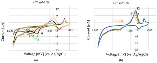 Cyclic voltammetry of 4.76 mM Ni2+ in a deep eutectic solvent (100 mM choline chloride in ethylene glycol): CV was performed with a potential range from +200 mV to −1200 mV at a scan rate of 50 mV/s. (a) Initial scans (1–5) showing the accumulation behaviour of nickel at the electrode surface. (b) Final scans (scan numbers 5 to 9, no. 9 shown in blue) after repeated cycling, highlighting changes in the current response due to electrode surface modification or nickel deposition.