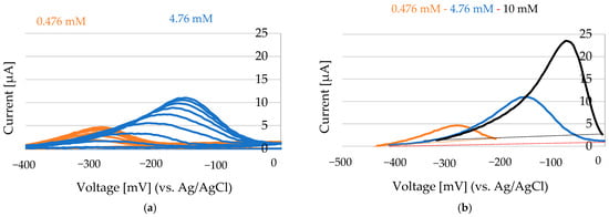 NiCl2 concentrations of 0.5 mM, 4.8 mM, and 10 mM (in 100 mM Choline Chloride in Ethylene glycol). Scans conducted at 200 mV to −1200 mV at a rate of 50 mV/s. (a) Selected anodic peaks between −400 mV and 0 mV. After the addition of NiCl2 (5 µL of 100 mM NiCl2 on the Au electrode that was covered with 100 µL of 100 mM ChCl-EG), the anodic peak increases continuously. (b) The last scans after anodic current stabilization for 0.475 mM Ni, 4.76 mM Ni, and 10 mM Ni.