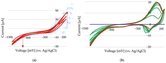 To evaluate the electrochemical performance of the screen-printed electrode array in Na2SO3 electrolyte, cyclic voltammetry (CV) measurements were conducted, as shown in Figure 6 As the nickel concentration increased, the cathodic current at −1000 mV shifted further in the negative direction (indicated by the blue arrow), while the anodic current also increased (red arrow), suggesting enhanced redox activity due to higher Ni loading on the electrode surface. A cycling protocol was introduced to improve the electrochemical response and better capture concentration-dependent behaviour.