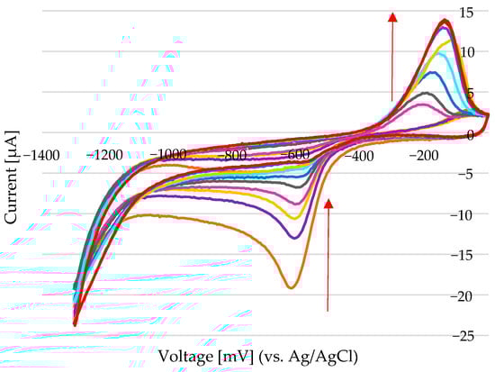 During a potential scan from 0 mV to −1300 mV at a scan rate of 50 mV/s (Figure 12), nickel deposition commenced with an initial cathodic current of −19 µA. The cathodic peak progressively decreased with continued scanning, reaching −3.4 µA by the final scan. Following deposition, the first oxidation peak appeared at approximately +3.4 µA. It increased steadily to 13.7 µA in subsequent cycles, indicating enhanced oxidation activity as more nickel was deposited on the electrode surface.