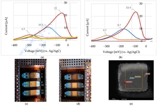 We applied the same electrochemical procedure across multiple electrodes within the screen-printed gold array to assess reproducibility. Figure 14a,b show the cyclic voltammetry (CV) results for 0.476 mM, 4.76 mM, and 10 mM Ni2+, as described in Figure 9b. These measurements were conducted on electrodes 3, 4, and 5 from the left-hand side of the array (Figure 14c), and electrodes 3, 4, and 5 from the right-hand side (Figure 14d), respectively. In all cases, NiCl2 was dissolved in 100 mM choline chloride–ethylene glycol (ChCl–EG), and the potential was scanned from +200 mV to −1200 mV at 50 mV/s. The photographs in Figure 14c,d show representative electrode surfaces after electrochemical testing, with visible darkened areas indicating the formation of Ni-containing species, such as nickel oxides and hydroxides. SEM characterization of electrode E1-L (Figure 14e) confirmed these deposits, revealing 4 wt% Ni in Area 2 and 1.2 wt% in Spot 2. Electrodes 1, 2, 7, and 8 were reserved for experiments in a 0.1 M Na2SO3 electrolyte system.