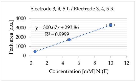 A linear dependence was observed between the cathodic peak current and the Ni2+ concentration when analyzing four Ni2+ concentrations ranging from 20 mM to 167 mM (NiCl₂·6H₂O) and when analyzing five Ni2+ concentrations ranging from 91 mM to 333 mM (NiSO4 6H2O) (Figure 7b). The presence of two linear ranges is attributed to the different electrochemical behaviours of Ni2+ ions at the Au electrode when derived from two distinct nickel salts—namely, NiCl2·6H2O and NiSO4·6H2O—under identical supporting-electrolyte conditions. Although Na2SO3 was used in both cases, the accompanying anions (Cl− or SO42−) from the nickel salts may still have influenced the electrochemical response of the nickel at the gold electrode, potentially through complexation equilibria or ion-pairing effects. Similar behaviour has been reported for DMG-based sensors [10].