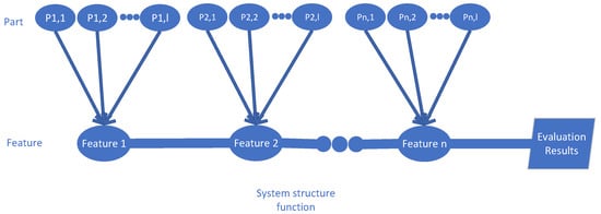 Subsequently, the structure function for the proposed impact weight evaluation model is constructed. In Figure 1, a Reliability Tree Diagram (RTD) is employed to describe the relative positions and logical relationships among all features, as well as the parts they contain. Based on the principle of cut sets, the branch–trunk set is defined as a collection of parts whose simultaneous failure leads to system failure. A minimal branch–trunk set refers to the smallest such set: if any part is removed, the remaining parts no longer constitute a branch–trunk set. In this study, the minimal branch–trunk set represents the minimal collection of parts within each feature that ensures the system’s reliability would be impacted. If denote the minimal branch–trunk sets for a given system, the structure function can be expressed as follows: