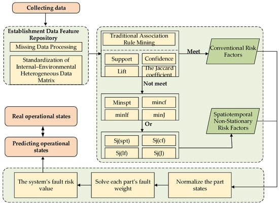 - Using the improved association thresholding method (Equations (15)–(18)), the association rule sets are divided into a frequent item set and a rare item set . Based on the improved association score calculation (Equations (18)–(23)), spatiotemporal non-stationary risk factors are mined from the rare item set . to characterize their impacts on the operational status of SF6 high-voltage circuit breakers;